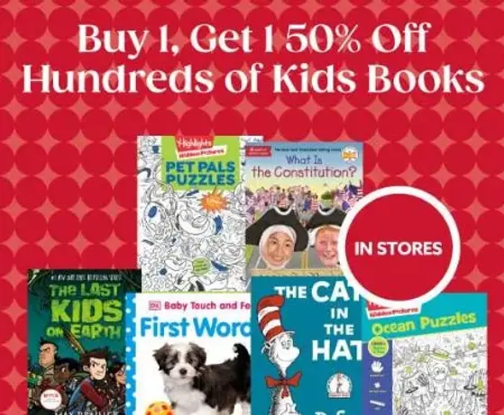 Hurry in and buy 1, get 1 50% off on hundreds of kids books in store.